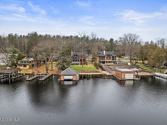 COME SEE THIS STUNNING 3,674 sq. ft direct waterfront on LAKE GEORGE custom-built home w/sandy beach & boathouse! Featuring an open floorplan, a floor to ceiling stone fireplace in the family room, wall of windows facing the lake, huge kitchen with pantry overlooking the dining room & covered deck right out onto the lake, primary bedroom w/ensuite, and laundry. The second floor consists of a second primary bedroom w/ensuite & private deck, two more bedrooms, another full bathroom, cozy nooks & office area. There is a partially finished basement being used as another lounge area complete w/pool table. Three car attached garage, sprinklers, generator & stone deck w/fire pit and grill. Short term rentals allowed! Furniture can be negotiated separately.
