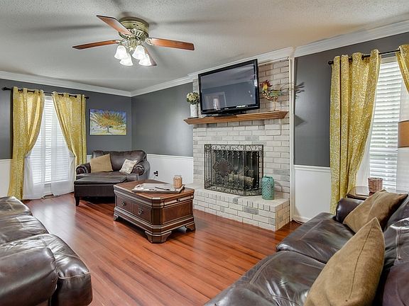 2 story brick home on cul-de-sac and beautiful lot. Hardwood floors added just 4 years ago and look brand new in living room, dining room and all upstairs bedrooms. Large eat-in kitchen, whirlpool electric range, LE refrigerator, tile floor in kitchen and laundry room. Living room has gas fireplace, French doors to new covered patio (2 fans and recessed lights), pool has new liner, owner's suite with double sinks in bath. Ceiling fan in every bedroom, also has walk-in closet and window. Double garage, ample storage, Rainbird sprinkler system, front and back yard.