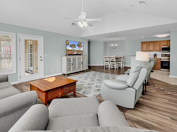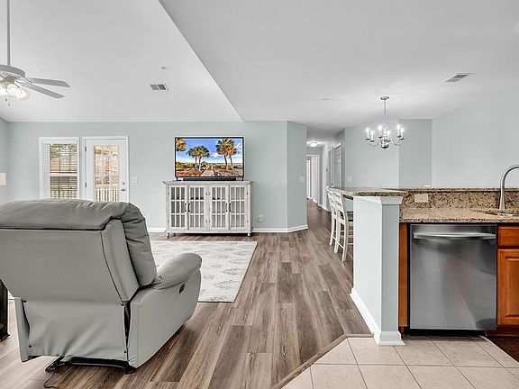 You are going to love this beautifully updated condo in Grand Vistas at International Club! This second floor, end unit overlooks the lake and is situated in the back of the community for a serene and peaceful setting. As you step in the door, you will find both a beautifully updated and well maintained home. The living room boasts vaulted ceilings, fresh and neutral paint, as well as lovely furniture. Enjoy the screened porch that overlooks the lake with access to the second bedroom (currently an office) and living room. The kitchen boasts granite countertops, subway tile backsplash, newer stainless steel appliances and updated sink and faucet. The primary suite offers dual walk-in closets and a gorgeous updated tile and glass shower and dual vanity with newer granite countertops. From the solid cherry bedroom furniture, to the 2019 HVAC and hot water heater on a bi-annual service contract, the seller has ensured this turn-key condo is completely worry free! The HOA replaced the roof in 2025 as well. You'll love that the HOA includes internet, cable, pest control, water and sewer and amenities including access to the pool at Parmelee! Located just minutes from some of the area's best golf, dining, and entertainment, not to mention incredible medical facilities and St. James High School, this home has it all! Take the 3D tour and schedule your showing to see this beautiful home today!