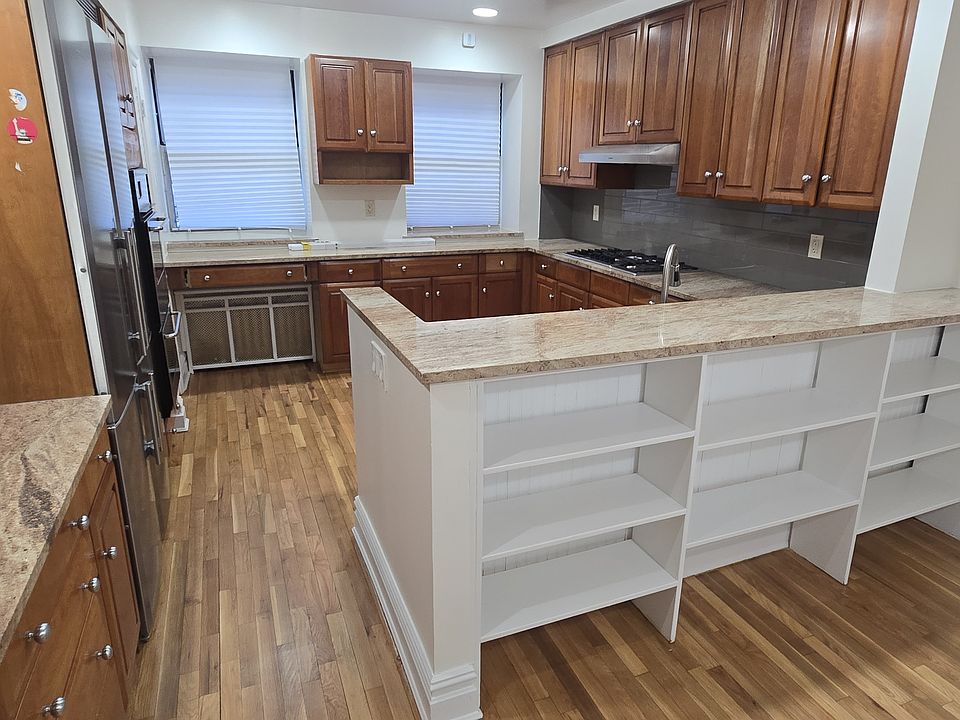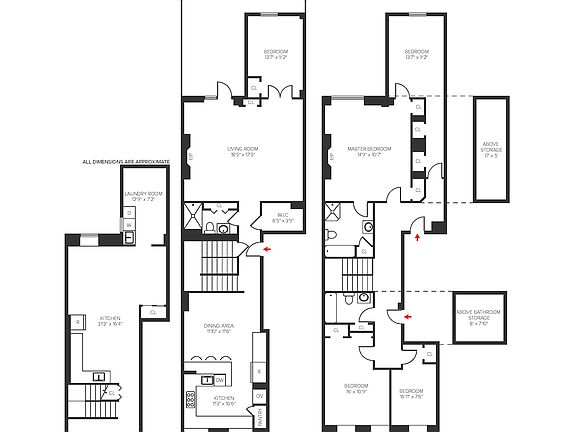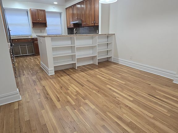 This unit is a triplex in a 5 story townhouse. The middle or ground level is the main entry. It has your kitchen, dining area, living room, den/guest room, full bathroom, and access to the large private garden patio. Liebherr built in refrigerator, double wall ovens, double sinks, bosch cooktop, and a pantry closet complete the kitchen. The top floor is the parlor level of the building with very high ceilings. It houses your master bedroom suite with decorative fireplace, plus 3 more bedrooms, 2 of which have large loft storage spaces. There is also a hallway bathroom on this floor. The lower level is 3/4 the length of the building, and has a recreation room with kitchen cabinets and sink, and a separate laundry room.