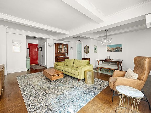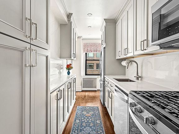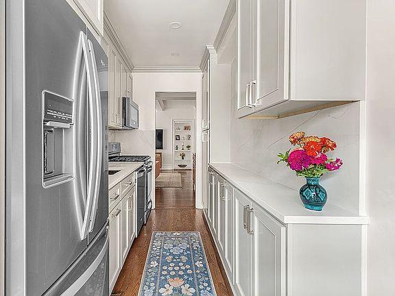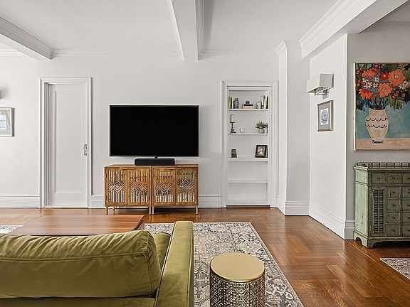 The sleek windowed eat-in kitchen was recently fully renovated with brand new stainless steel appliances and Caesarstone countertops and backsplash. A separate bedroom wing offers smart separation; each is well-sized and the primary has a large walk-in closet. The clever fourth bonus room is currently being used as a nursery and is also suitable for home office use or additional storage. Both bathrooms are also renovated with double sinks in the primary. A hidden walk-in closet also adjoins the living area. Pre-war touches are right where you expect to find them: beautifully-refinished hardwood floors, crown and baseboard moldings, high beamed ceilings, and tasteful proportions throughout.