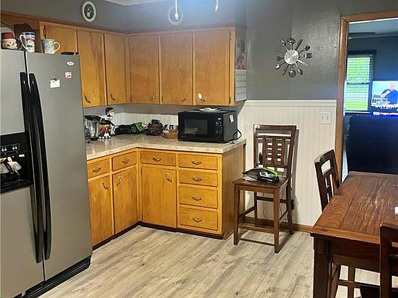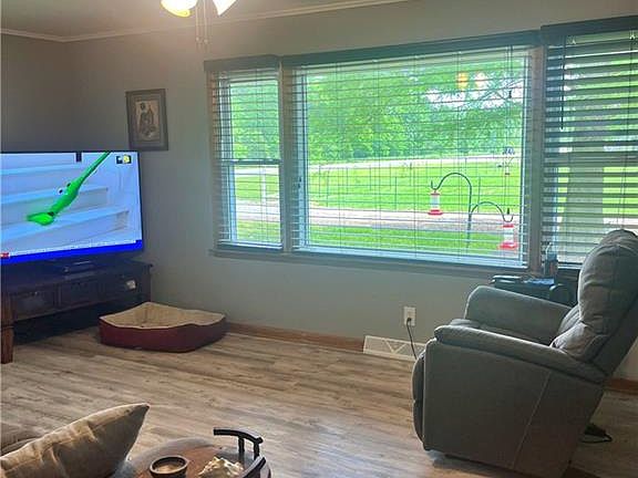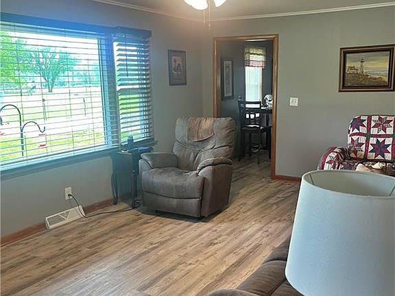 Adorable home on 4.8 acres, fenced in yard & pasture. 31x23 detached garage/barn & outbuilding. Two bedrooms that could be made into 3 very easily (was 3 at one time) and both would have closets. Nice walk-in shower in bathroom. Paved road.