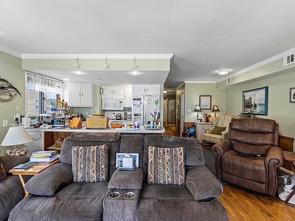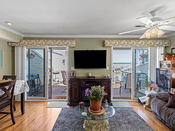 Million-Dollar Water Views for Under a Million! Wake up to breathtaking sunrises over Hereford Inlet and the Atlantic Ocean from your private north-east facing balcony. This 3-bedroom, 2-bath, 2nd-floor unit at Inlet Condominiums offers immediate access to the North Wildwood Seawall. Enjoy hardwood and tile floors throughout, ceiling fans in every room, and recessed lighting complementing the natural light. The open-concept living area and kitchen are perfect for entertaining, with a convenient peninsula for casual dining. Plenty of storage is available with multiple closets and attic space. The master bathroom features a walk-in shower. Parking is a breeze with a two-car tandem garage and an additional driveway space, providing ample room for beach gear and even a golf cart. Start building unforgettable family memories in this prime North Wildwood location.