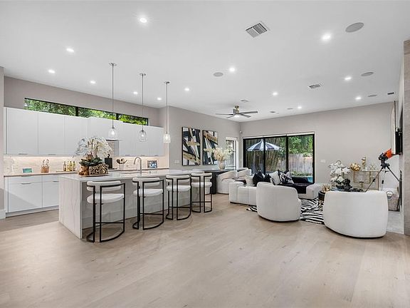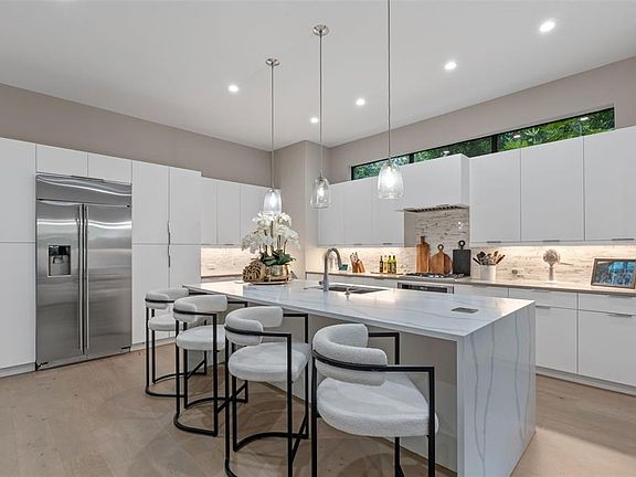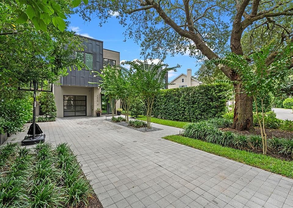 Modern Elegance in the Heart of Winter Park! Located just a half-mile from the renowned shops and dining of Park Avenue, this architecturally striking residence blends luxury, modern design, and thoughtful functionality. Designed by Michael Wenrich and built by Jim Winters, every inch of this home reflects exceptional craftsmanship and elevated taste. A long paver driveway welcomes you with ample guest parking and leads to a bold yet welcoming facade—complemented by large-scale windows and a sleek glass garage door. Natural light floods the interior, emphasizing the open-concept floor plan and seamless indoor-outdoor flow. Step into a dramatic two-story foyer and be welcome inside to wide-plank wood flooring, modern lighting, tall baseboards, and a black metal staircase railing. The main living spaces are open and airy, anchored by a gas fireplace with a floor to ceiling mantle. At the heart of the home is a show-stopping kitchen equipped with GE Monogram appliances, including a gas range and under-counter microwave. An eat-in[.n.,mmnm, waterfall island, complemented by under-cabinet lighting, a marble backsplash, and double-barrel under-mount sink with extendable faucet. Tall glass doors and expansive windows blur the lines between inside and out. A collapsible sliding glass wall opens to the private backyard, featuring a cocktail pool, outdoor shower, lounge deck, and built-in plumbing for a future summer kitchen. Mature landscaping ensures privacy and serenity. Upstairs, you’ll find three spacious en-suite bedrooms, each with custom closets, high ceilings, and stylish, neutral finishes. The second-floor laundry room adds convenience with matching cabinetry and a stainless utility sink. The primary suite is a true retreat, offering direct access to a private upper deck overlooking the backyard. The spa-inspired bathroom features a dual-head glass-enclosed shower, floating double vanity, custom closets, and elegant lighting. This home is a rare opportunity to own a piece of modern luxury just steps from everything Winter Park has to offer. Schedule your private showing and experience this stunning home for yourself.