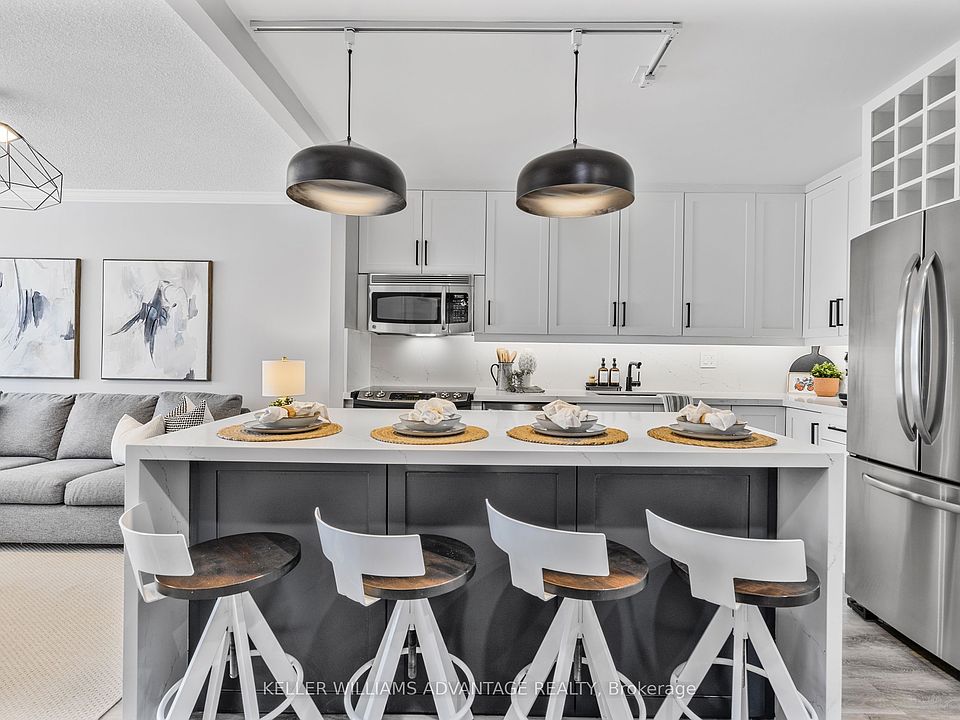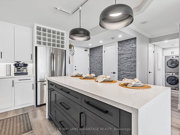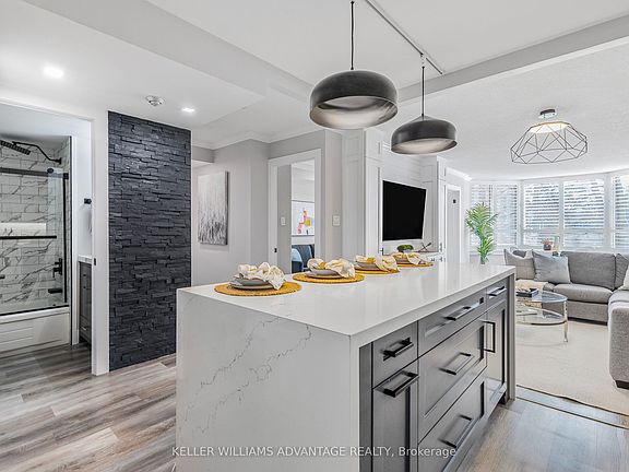 Welcome to Luxury Living by the Lake. Discover this rarely available, beautifully renovated 3-bedroom + solarium, 2-bathroom condo offering 1,184 sq. ft. of modern elegance and thoughtful design. Fully transformed in 2022 by White Elm Design & Build, every inch of this home has been curated with high-end finishes and timeless style. Flooded with natural light, the open-concept layout features expansive windows fitted with California shutters (covered by a 25-year warranty). The chef-inspired kitchen is a standout, boasting quartz countertops, matching backsplash, a large island, and sleek GE stainless steel appliances perfect for entertaining or everyday living. The spacious living area includes a custom built-in entertainment unit, while the sun-drenched solarium offers an ideal spot for a home office, reading nook, or creative space. Retreat to the luxurious primary suite featuring a striking feature wall, oversized bay window, and a spa-like 6-piece ensuite. Convenience is key with in-suite laundry, equipped with a stacked Samsung washer and dryer. Residents enjoy an array of resort-style amenities: an outdoor heated pool, tennis courts, BBQ patio, indoor squash and racquetball courts, full gym with cardio room and tanning studio, guest suites, party lounge, visitor parking, and 24-hour gated security with concierge service. Just a 5-minute walk to Lake Ontario and Spencer Smith Park, and offering easy access to the QEW, 403, and 407, this condo delivers the perfect blend of vibrant waterfront living and commuter-friendly convenience. Dont miss your chance to own in one of Burlingtons most coveted communities.