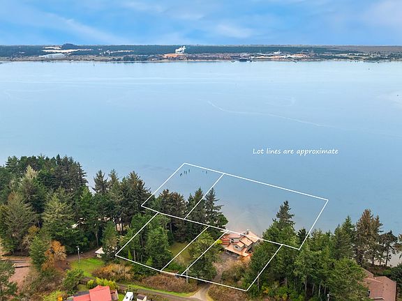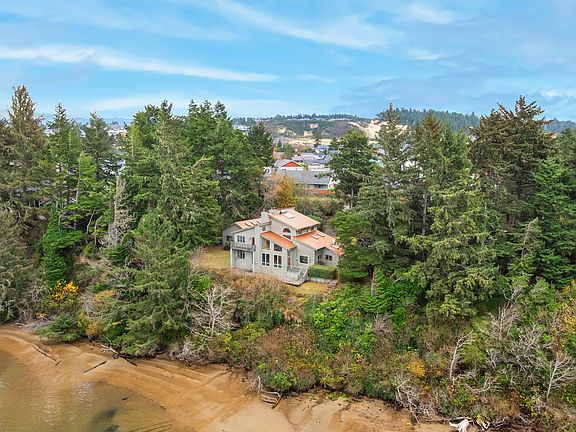 Beautiful west facing property set on Coos Bay. The property offers sweeping waterfront views with stunning sunsets beyond words, and a rare combination of privacy, space, and future potential. The main home is generously scaled, with dramatic ceiling heights and an open layout that feels bright and airy from the moment you walk in. The main level includes living, dining, kitchen with walk in pantry, main floor bedroom, a full bathroom, office and laundry room.Upstairs, the primary suite is spacious, quiet, and perfectly positioned to take in the bay views along with an additional guest bedroom. The detached 4 car garage/shop, large enough for serious hobbies, storage, or conversion possibilities.Above the shop is a private studio apartment with its own exterior entrance. Complete with a kitchenette, open living/bed area, and full bath. Perfect for guests, extended family, or rental income.The property includes a total of 3.06 acres with all 5 tax lots. The house, garage/shop and yard is on 2 tax lots totaling .61 of an acre.Included is an adjoining tax lot that is .65 of an acre offering a potential secondary building site (Buyers to verify with the City of Coos Bay).There are also 2 more additional tax lots totaling 1.80 acres, that are in the bay.What makes this location truly special is the daily show on the water with ships, barges, tugboats, and local fishermen coming and going, with tides and light constantly shifting the scenery. Evenings bring vibrant, colorful sunsets, and the wooded surroundings add to the sense of privacy. Featuring city services and only minutes from ocean beaches, chartered fishing, crabbing, botanical gardens, restaurants, groceries, and in town conveniences.A unique waterfront opportunity with space, versatility, and some of the best views on the bay. It’s truly an ideal canvas for someone ready to fine-tune their dream waterfront retreat.