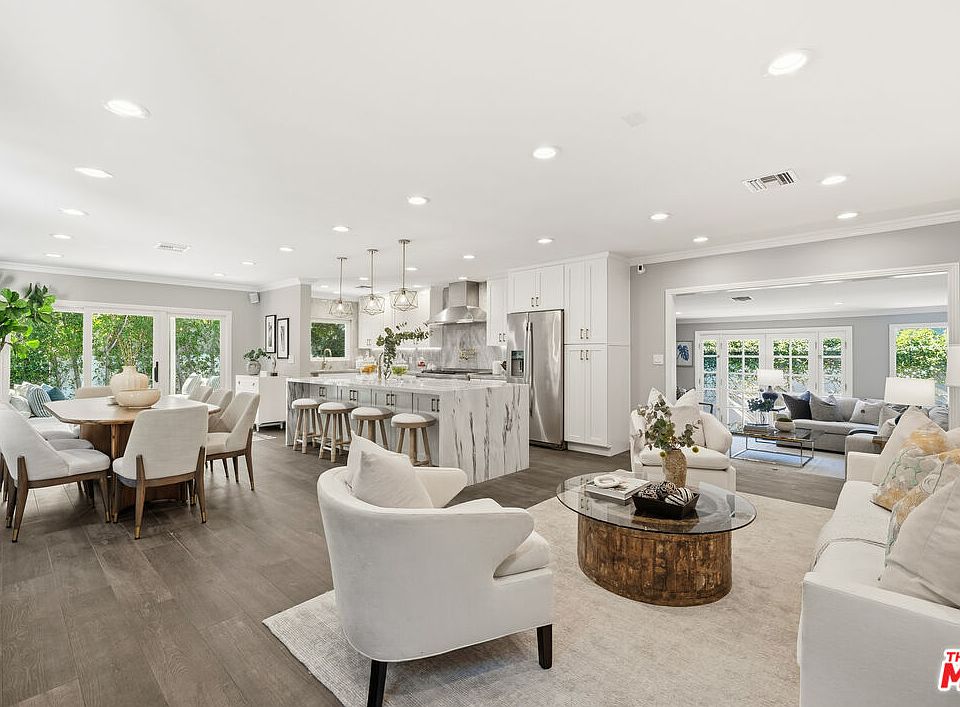 Nestled in Studio City's highly coveted Beeman Park neighborhood on a corner lot, this fully remodeled 3 bedroom, 2.5 bathroom residence seamlessly blends refined European craftsmanship with modern California living. Every detail has been thoughtfully curated to reflect understated luxury, durability, and comfort.Inside, you'll find Italian wood-look porcelain flooring throughout the bedrooms offering the warmth of wood with the lasting strength of porcelain. The chef's kitchen features a striking marble island and matching marble countertops, complemented by custom Pella windows installed by Pella-certified professionals to ensure top-tier precision and energy efficiency.The primary suite is a true retreat, showcasing Italian marble on both the bathroom floors and shower walls, Schluter waterproofing systems, and heated floors extending into the shower for spa-like indulgence. The secondary bathroom highlights a curbless shower with Bianco Carrara marble in a chevron pattern, Belgian Bluestone marble wall cladding, and a Restoration Hardware vanity again featuring Schluter waterproofing and radiant heated floors. A third designer bathroom continues the theme with a Restoration Hardware vanity, marble mosaic flooring, and classic white subway tile walls finished with the same professional Schluter shower system. Step outside to your private Italian porcelain-tiled patio, complete with a covered trellis, PebbleTec pool and spa, glass mosaic waterline tile, built-in gas BBQ and fire pit creating the perfect backdrop for effortless entertaining and year-round California living. This home represents the best of Studio City luxury, a turnkey masterpiece in the heart of Beeman Park, designed for those who appreciate quality, craftsmanship, and comfort at every turn.