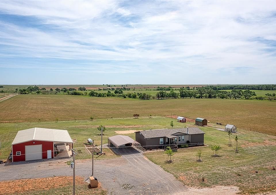 HOME and SHOP on 30 ACRES MOL. Spacious 2040 sq. ft. SOLITAIRE manufactured home was placed on a full 6" concrete pad. With 3 bedrooms, 2-1/2 baths, the open floor plan combines the living room, dining area and kitchen. There is a 10x8 covered porch on the front entrance and a 12x25 covered deck on the back. To protect your vehicles from Oklahoma storms is a 22x35 metal carport with storage area.