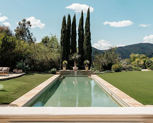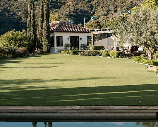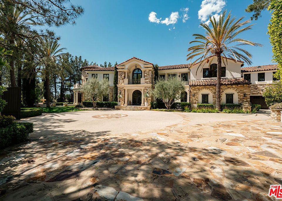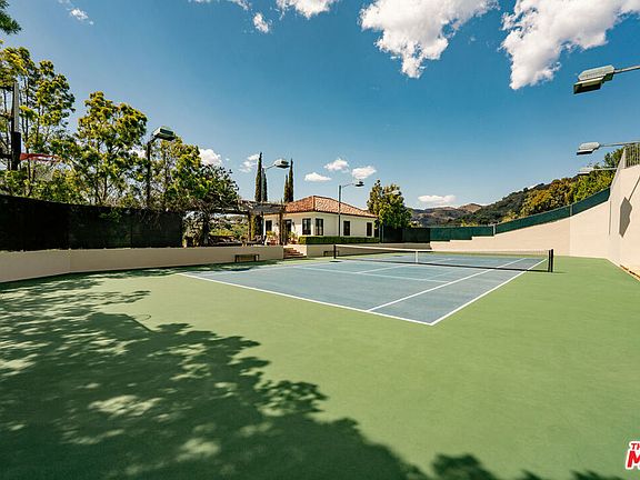At the end of a cul-de-sac in ultra-exclusive Brentwood Country Estates lies a sprawling Tuscan residence set on manicured grounds. Guests arrive through a large iron gate and into a massive motor court, its perimeter lined with privacy hedges beneath towering palms and Mediterranean cypress. Enjoy striking panoramas of vivid green hills, canyons, and untouched mountains beyond. A lighted north-south tennis/pickleball court includes a trellis-covered viewing pavilion, basketball hoop, equipment storage shed, and a freestanding wellness gym for meditation, yoga, and fitness. Inside, a double-height foyer is characterized by a grand staircase and rich wood floors that flow into the public entertaining spaces. Host intimate gatherings in the family room, complete with fireplace and wet bar, or have tea in the formal living room, each space connected by a series of romantic archways overhead. The chic formal dining room connects to the kitchen via a butler's pantry, perfect for catering. Fit for a true gourmand, there are two islands with farm sink, state-of-the-art appliances including double Sub-Zero refrigerator, and chef-grade range with pot filler. There is also a sun-filled breakfast rotunda with multiple sets of French doors to the outside, creating an effortless indoor-outdoor flow for al-fresco living and dining. Upstairs, a sumptuous owner's wing contains a resort-inspired primary bedroom suite complete with fireplace, parlor, two large boutique-style closets, and a spa-inspired bath with floating dual-sink vanity, separate soaking tub, oversized rainwater shower, and toilet room. Secondary en-suite bedrooms are spacious and include private balconies and patios. There is also a theatre/media room for gaming and screening films, an office for work and study, and massage/spa room. At the center of the residence is an outdoor living room with double-sided fireplace flanked by dramatic archways. Additional outdoor amenities include a putting green, pool, spa, sundeck, organic vegetable and rose gardens, built-in barbecue, pathway to delightful garden swings, and numerous patios and terraces throughout. There is even a dog house with dedicated play space! Welcome to an extraordinary life of peace and comfort in a coveted guard-gated community in Lower Mandeville Canyon with 24-hour patrol, just moments to Brentwood's fine restaurants, Santa Monica's cafes and shops, world-famous beaches, and all the Westside provides.