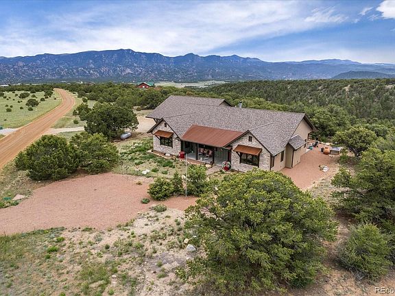 Beautiful Mesa Antero ranch home. This house is a ten out of ten. Located in the Filing 5 section of Mesa Antero, you have easy access and absolutely incredible views. The floorplan for this home is extremely thoughtful. You walk up to a friendly front patio and into the foyer. There is a hall to the left with two big bedrooms and a Jack and Jill full bathroom. The north bedroom has stunning views and the south bedroom has a private exterior door to the back patio. The living room is spacious with a rock faced fireplace that has a worn wooden mantel. Behind the fireplace is the kitchen and dining room. High end finishes and appliances make this space comfortably functional as well as really pretty to look at. The island is a raw edge slab taking the luxury of the other features and keeping it rustic. The primary suite is a dream. The bedroom only has one door. This makes this big room feel very quiet and still. A full, five piece bath is in the suite hallway with a soaker tub and tiled walk in shower. Through the huge attached closet, there is a barn door that opens to the laundry room! This rooms has rows of cabinets and is great for efficiency and organization. Through this room is the garage and the other direction takes you back to the kitchen. It is a design that really works. Outside is a place you will want to be. The back patio is covered and private. There is a barbeque area, a little greenhouse/raised bed area, and is a perfect place to relax and enjoy the Colorado nights. We are excited to show you around this property!