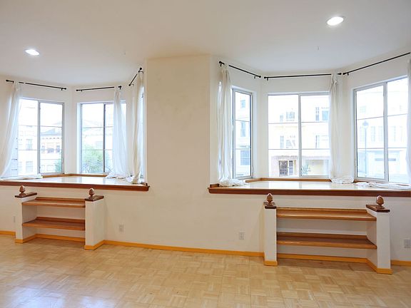Elegant 3BR/2BA flat in the Sunset near the Haight-Ashbury neighborhood. Floors are hardwood, carpeted and tile. Heat is forced air. L-shaped, partially open living room has parquet hardwood floor, two large bay windows with seats and shelving, and a decorative fireplace with built-in shelves. Dining space is outside one of the kitchen's two doors, in front of one of the bay windows. Kitchen is in one corner of the living room. It includes gas range, double oven, dishwasher, and has lots of cabinets. Master bedroom is at the back of the flat, overlooking the yard. It is carpeted and has a short hallway with facing, sliding mirror door wall closets. It connects to the private bath. Bath has his-and-hers sinks and shower-over-tub with sliding glass doors. Second bedroom is adjacent to the master bedroom and also overlooks the yard. It is carpeted, has a wall closet with sliding mirror doors, and sliding glass doors opening onto the fire escape. Third bedroom is mid flat. It has parquet floor, washer and dryer in a closet with folding doors, and a standard closet. Shared bath has sliding glass doors and the linen closet is down the hall, next to the two rear bedrooms.