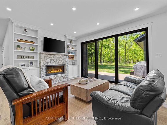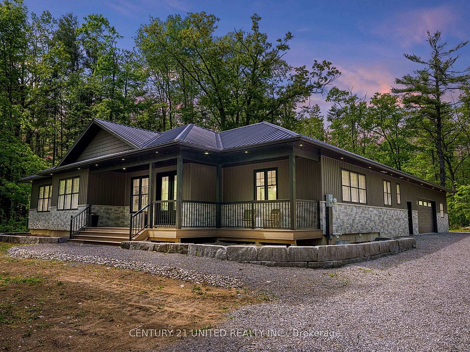 Welcome to 1271 Northey's Bay Road in North Kawartha, a stunning property tucked away on a scenic backlot just off the shores of beautiful Stoney Lake. This custom-built bungalow, completed in 2022, sits on a picturesque 2-acre lot surrounded by mature trees, offering both privacy and natural beauty. From the moment you step inside you'll be immediately welcomed by an abundance of natural light pouring in through the oversized double sliding glass doors, offering a clear view of the backyard and TrexDeck. The living room showcases a stone veneer fireplace flanked by custom built-in cabinets and shelving. Designed with the home chef in mind, the kitchen features generous cabinet and shelving space, Quartz countertops, a massive island with seating for six, and premium built-in stainless steel KitchenAid appliances. Just off the kitchen is a large combined laundry and mudroom, complete with a two-piece bathroom, and direct access to the garage. Down the main hallway, the spacious primary bedroom offers oversized sliding doors leading to the back deck, a walk-in closet, and a luxurious 4-piece ensuite featuring double sinks. Two additional bedrooms are located across the hall, along with another stylish 4-piece bathroom. The main floor boasts modern pot lighting and durable, stylish Twelve Oaks luxury flooring throughout. The lower level includes a rough-in for a future bathroom, offering even more potential living space. The attached 20x40 heated garage is a standout feature, with two separate man doors one leading to the driveway, the other to the backyard and an additional rear-facing garage door for convenient access to yard equipment. Its even equipped with hot and cold water hookups, perfect for washing vehicles or gear. And lets be honest why settle for just one garage when you can have two? At the end of the driveway, you'll find a second detached double garage, ideal for storing additional vehicles, tools, or all your outdoor toys.