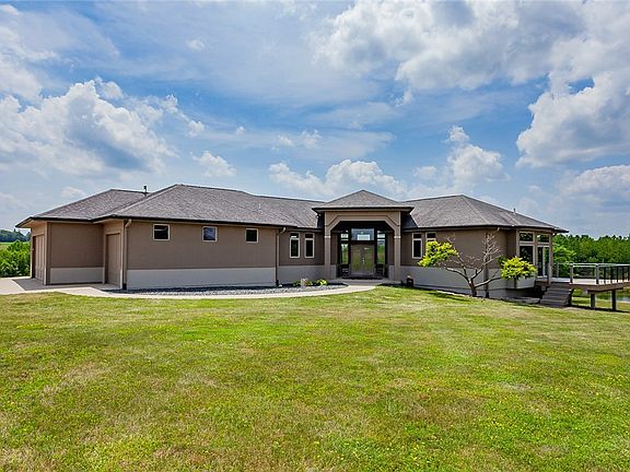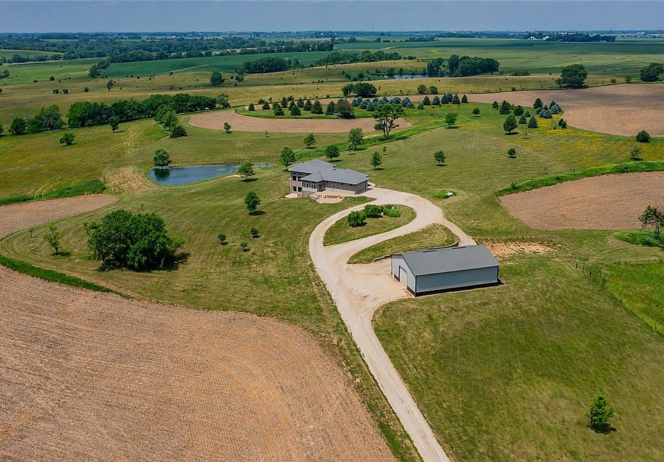 Amazing acreage nestled in the rolling hills of Madison County, in the award winning Van Meter school district. This meticulously cared for modern home sits on nearly 18 acres and includes a stocked pond, 2 patios, wildlife, and breathtaking views from every part of this home. The main level of the home features a beautiful kitchen with center island, walk in hidden pantry, soft close cabinets, double fridge and wall oven. In addition there is a sitting area and family room that share a 2 sided f/p, a/v closet and huge picture windows. The master suite with private deck and private bath and laundry round out the main level. The finished w/o lower level offers in-floor heating, 4 additional bdrms, 2 bths, family room, storm shelter/wine cellar. Other features include energy efficient geothermal heating and cooling, and a 40x60 outbuilding for storage of all your equipment and toys. All information obtained from Seller and public records.