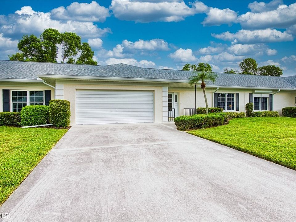 This METICULOUSLY-MAINTAINED "condo-villa" with a BRAND NEW ROOF is calling you home to Brandywine of Myerlee! This 55+ GOLF CART-FRIENDLY community has a GUARDED GATE, lots of amenities, and is a short drive to SWFL's finest beaches! Providing 2 bedrooms and 2 baths on a SPLIT FLOOR PLAN, spanning nearly 1600sqft, this SPACIOUS home also features a 2-CAR GARAGE and an EXPANISVE AIR-CONDITIONED LANAI, ensuring plenty of room for entertaining friends and family. The kitchen offers ample storage with warm WOOD cabinets and a matching pantry, as well as a generous countertop area and classic white appliances. NEUTRAL carpet, tile, and walls are a canvas begging for your creative, personal touches to make it truly your own. Brandywine offers a community pool, bocce, tennis, pickleball, billiards, library, exercise room, and more; plus, the perfect location positions it near tons of shopping, dining, and entertainment! GOLF MEMBERSHIPS or PAY-TO-PLAY at Myerlee G&CC available. No pets, sorry! Scoop us this rated "BEST VALUE BUY" before it's too late and start living your Florida dream life today!