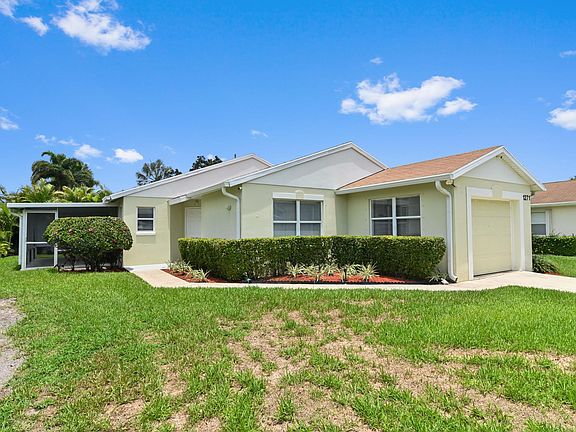 All new air-conditioning system installed with 8 years remaining on the warranty. Includes complete system with new lines and a motorized skylight in the bathroom! Discover your perfect retreat in The Palm Club Village, West Palm Beach! This charming single-family home features 2 beds & 2 baths, providing a comfortable and inviting living space. With an attached garage and vaulted ceilings, this home offers both convenience and a spacious feel.Step into the dining room, where sliding doors lead you to a serene screened patio and backyard, perfect for outdoor relaxation and entertaining. The kitchen boasts a stylish tiled backsplash, ideal for culinary enthusiasts. The main bedroom is a true oasis, complete with a walk-in closet and ensuite bath for added privacy and comfort. This delightful home is nestled in a well-maintained community offering numerous resort-style amenities. Enjoy the peace and quiet of a serene neighborhood while being just minutes away from premier shopping, dining, and entertainment options.