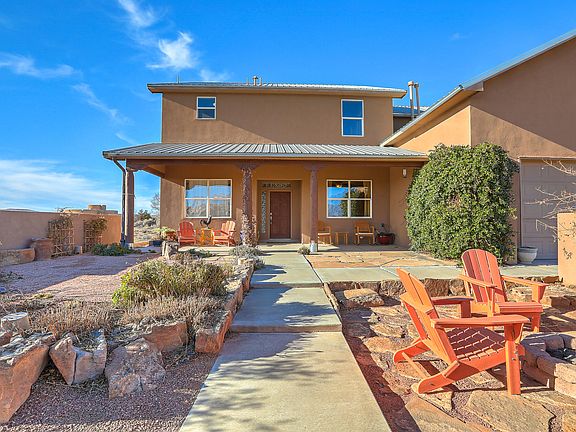 Beautiful custom built home. Views of the Sandia Mountains and the southern Horizon are wonderful and enjoyed from the front or backyard fire pits. The kitchen features a large granite island, stainless appliances including a gas cooktop. Primary suite on the main level, with large luxurious bathroom and walk in closet. Also downstairs is an office/sitting area & dining room. Upstairs there are 3 additional bedrooms, including one that is en-suite. The loft spaces are great gathering areas and office or study space. Home Theater is enjoyed by all. The theater equipment and seating will convey to buyer. If you want Multigenerational living, come check out this home. The large covered patio & landscaped yard are paradise and great for entertaining.