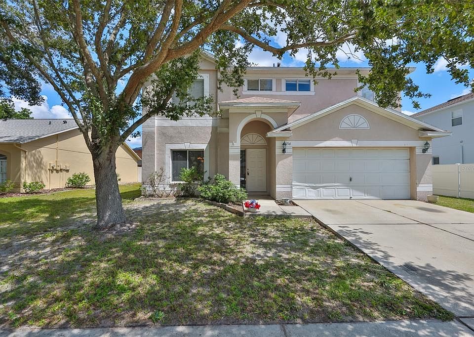 Welcome to this inviting two-story home in the Copperfield subdivision, part of the sought-after Summerfield Village community, where comfort meets convenience in a vibrant golf and amenity-rich setting. Step through the front door into a light-filled foyer that leads to a spacious formal living and dining area, accented with classic chair rail detailing. The kitchen offers abundant cabinetry, a window overlooking the backyard, and a cozy eat-in space that opens to the great room-perfect for gathering with family and friends. A NEW ROOF (2022) provides added peace of mind. You'll also find a large storage area tucked under the stairs for seasonal items or household extras. The first floor is finished in beautiful wood-grain laminate flooring, with vinyl in the conveniently located half bath for guests. Journey upstairs to find a versatile loft-ideal as a playroom, home office, or reading retreat. The primary suite, set apart for privacy, features a generous Ensuite with walk-in closet, dual vanities, a relaxing garden tub, and a separate shower. Two additional bedrooms share a full bath, and the laundry room, complete with washer and dryer, is conveniently located on this level. Upstairs is carpeted throughout the bedrooms and loft, with vinyl flooring in the laundry room and bathrooms for easy care. The oversized two-car garage with built-in cabinets includes a dedicated workshop area for hobbies or projects. The home sits on a large, partially fenced lot that can easily be extended, with a side gate, to a fully fenced yard, offering flexibility for pets, play, or gardening. Enjoy close proximity to the Summerfield Community Center, where residents have access to 2 pools, an indoor basketball gym, fitness rooms, tennis and volleyball courts, a dog park, playground, pavilion, and event rental hall. Golf enthusiasts will love the nearby Summerfield Crossings Golf Club with its 18-hole course, driving range, putting green, on-site grille, and banquet facility. Very easy commute to Tampa! Very close to World Renowned Sugar Sand beaches in any direction, a public boat launch, Freedom Boat Club, Tampa Bay City Life, International Airports and Hospitals. With low HOA fees, NO CDD fees, and peace of mind knowing the home is not located in a flood zone, this is a rare find. This property was appraised in June 2025 for $356,000. It is listed $32,000 below appraised value. Don't let this opportunity slip away-schedule your private showing today before this gem is going. going gone!