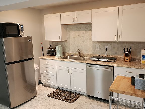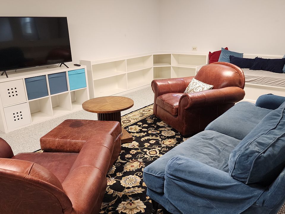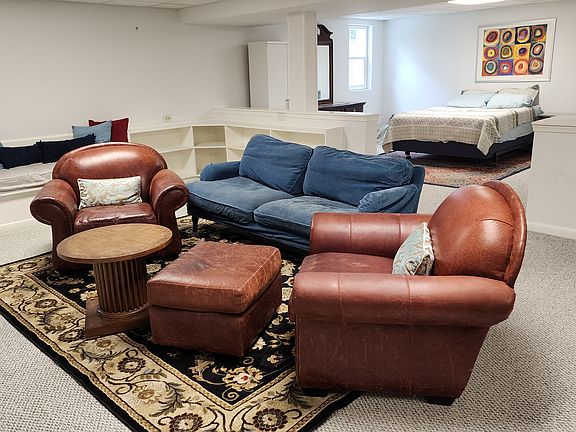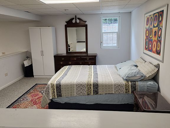 Newly installed egress windowFurnished basement studio apartmentOpen-plan basement studio apartmentQueen bedGarbage disposalDouble induction hot plateAll-new kitchenette