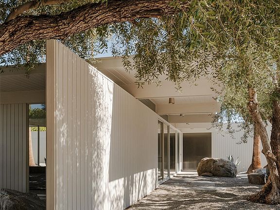 Donald Wexler, FAIA, Architect | The Wexler Residence, 1955. The property is listed on the National Register of Historic Places, and is designated as a Palm Springs Class 1 Historic Resource, with substantial Mills Act tax savings. On nearly a third of an acre in the fashionable Movie Colony East, just two blocks from Ruth Hardy Park, the architect’s own home stands as a testament to the enduring appeal of Mid-Century Modern design. Donald Wexler—widely regarded as the father of desert modernism and “the architect who gave shape to Palm Springs,” according to The New York Times—is celebrated for the Palm Springs International Airport, the Dinah Shore estate, and the innovative Steel Development Houses. Here, in the home where Wexler lived with his family for nearly forty years, he applied a softer hand with an all-wood structure inspired by his apprenticeships with Richard Neutra and William F. Cody. The wood post-and-double-beam system, a Wexler signature, created a flexible open plan that could evolve with family life. Interior walls extend through floor-to-ceiling glass, visually merging indoors and out. Tongue-and-groove ceilings, slender fascia, and deep overhangs lend both elegance and shade. The current steward has preserved these defining elements—vertical fir siding, spun metal can lights, and other original finishes—while collaborating with Wexler himself, architect Lance O’Donnell, and designer Darren Brown on a full restoration that earned the Palm Springs Modern Committee’s Residential Restoration of the Year Award. New terrazzo floors, stainless steel appliances, marble surfaces, and European fixtures align the home with contemporary standards, unified by a custom “Wexler White” palette. A new roof, HVAC, and solar system complete the upgrades. The site, enclosed by a tall hedgerow, opens inward to ancient boulders, native plantings—likely by landscape designer Antone Dalu—and a black-bottom pool and spa framing distant San Jacinto mountain views.