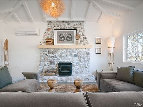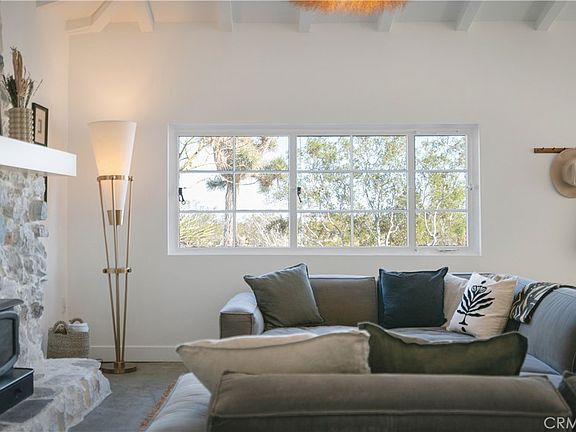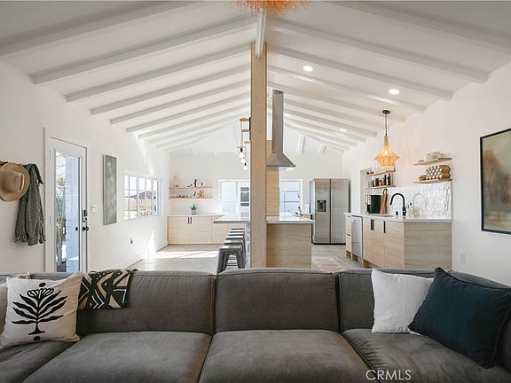 Features include an open kitchen with functional quartz island, custom lighting and built in cabinets/shelving. Kitchen opens into the living room with vaulted beamed ceilings, wood burning stone fireplace and views onto acreage of gorgeous gardens. Four private bedrooms all feature stunning views to high desert paradise.