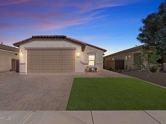 This magazine ready 3-bed + den home in Ironwood Crossing offers a desirable split floor plan and stylish wood-look laminate floors throughout. The curb appeal features low maintenance turf & extended paver driveway. Step inside to the stone faced entryway. The upgraded kitchen shines with quartz counters, tall cabinets, & interior designer's choice of pendant lighting. Bright and open living room features a custom built-in entertainment center and oversized slider leading to a tiled patio, lush green grass, and gas fire pit—perfect for entertaining & the upcoming crisp winter nights. Spacious primary suite includes double vanity, soaking tub, walk-in shower, and a massive walk-in closet. Additional upgrades include the extended epoxy garage with sink & water filtration/softener. Conveniently located minutes from Queen Creek shopping & dining, including Costco and Target, with easy 24 Freeway access. Ready to welcome you home!