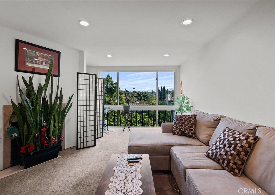 Living and Dining Area: Open-concept design with wide-view double-pane windows, gas-burning fireplace, and recessed lighting throughout.
