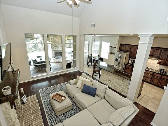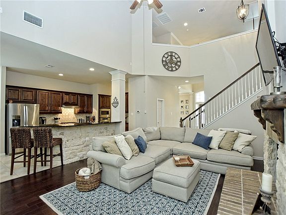 This Steiner Ranch Beauty is nestled on a large lot with only one neighbor. This amazing corner lot backs to a greenbelt and is within walking distance to top rated River Ridge Elementary. The oversized back yard has new sod, tons of privacy and plenty of room for a pool. The home boasts raised ceilings in the entry and living room with 3 large windows that look out to the gorgeous covered patio with brick fireplace, ceiling fans and a TV. The master bedroom is downstairs and has an oversized bathroom and walk -in closet. Beautiful Hardwood floors in the living room and dining room and great selections in the kitchen make this a designers dream! Upstairs is a large living/ play room, and 3 bedrooms plus one bathroom. The oversized 2 car garage is big enough to store your kayaks and paddleboards for easy access! Don't miss out on this amazing home!