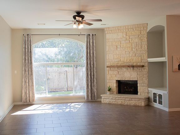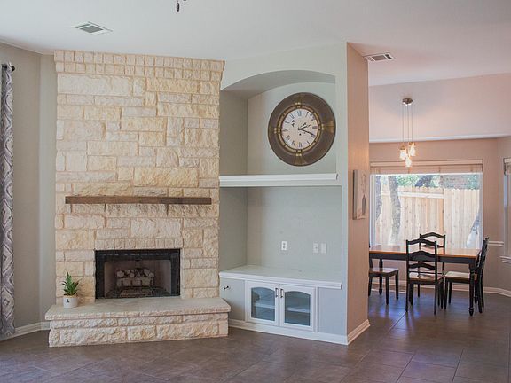 Located in Steiner Ranch, 12721 Oxen Way is within walking distance of John Simpson Community Center, which features a pool, splash pad, tennis courts, sand volleyball court, playground, and trailhead access to hike and bike trails. This home features a backyard great for relaxing and entertaining, complete with a covered patio and pergola. The home backs to a greenbelt for added privacy and nature views. The kitchen has Shaker-style cabinets, granite counters, breakfast bar, tile backsplash, walk-in pantry, and a pendant-cluster ceiling light. Stainless steel appliances include oven, cooktop, microwave, dishwasher, and vent hood. The spacious family room has a large, arched window that overlooks the back yard, alongside a floor-to-ceiling stone fireplace with gas logs. The master bedroom has a walk-in closet, windows with blinds and curtains, and a ceiling fan. A unique flexible space within the bedroom can be accessed through French doors. This space includes a built-in desk, cabinets, ceiling fan, and a window with curtains & blinds. The room makes a great office, craft room, nursery, or exercise space. The master bathroom has separate updated vanities, updated shower with tile surround, garden tub, a water closet, and a linen closet. There is tile flooring throughout the home. In addition to the adjacent greenbelt, this property has plenty of trees for added privacy and shade during hot Texas summers. Steiner Ranch offers access to Lake Austin, has three community centers, and a dog park.