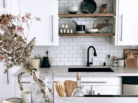 The living space features modern furnishings, warm wood tones, neutral finishes, and greenery for a balanced and comfortable atmosphere. The kitchen includes new, updated quartz countertops and sink, open and closed shelving, and stainless steel appliances. The bedroom provides a quiet retreat with bamboo flooring and soft lighting, and the bathroom features elegant stone tile and updated counters/fixtures.