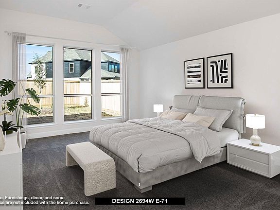 Home office with French doors and 11-foot ceiling set at two-story entry. Open kitchen features generous walk-in pantry and island with built-in seating space. Dining area opens to two-story family room with wall of windows and wood mantel fireplace. Primary suite includes bedroom with 10-foot tray ceiling. Double doors lead to primary bath with dual vanity, garden tub, separate glass-enclosed shower and large walk-in closet. An additional bedroom is downstairs. Secondary bedrooms and game room with 10-foot tray ceiling are upstairs. Mud room off two-car garage.