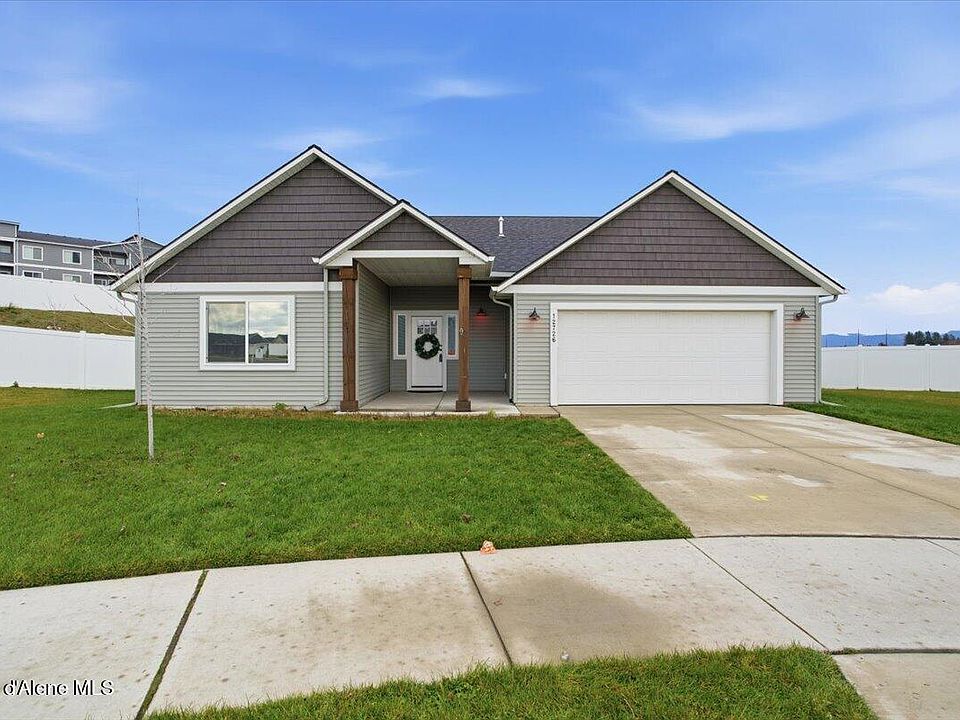 Nestled in the Brookshire neighborhood of Rathdrum, this residence is situated on a large lot within the Lakeland School District. The inviting open-concept design highlights the expansive great room, seamlessly flowing into the kitchen and dining area, accentuated by a vaulted ceiling that enhances the sense of space. The kitchen features a large pantry, perfect for hosting gatherings and meals. Abundant windows bring in natural light and offer picturesque views of the surrounding land. Introducing the popular Powderhorn Bay floor plan, a versatile single-story home that spans 2,132 square feet of thoughtful design. This layout features three bedrooms, including a spacious primary suite with a walk-in closet and an ensuite bath equipped with a walk-in shower and dual sink vanity. Two guest bedrooms and a well-appointed guest bath provide ample space for visitors. The home also includes a convenient laundry room and a two-car garage, making it ideal for those seeking extra storage.