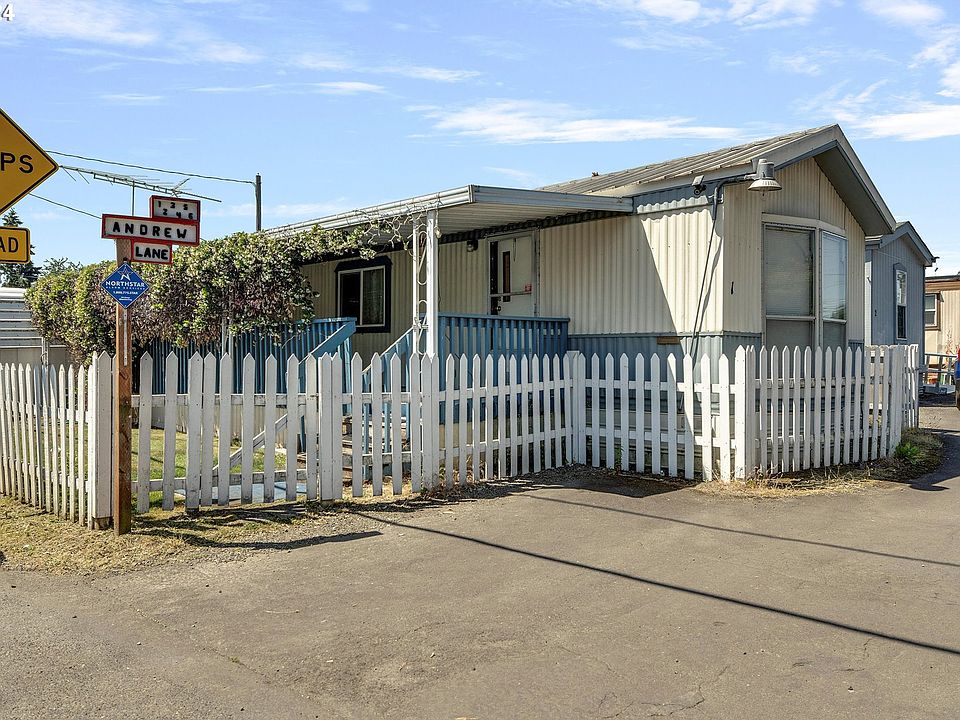 Charming white picket fenced single wide manufactured home conveniently located close to transportation, food, and shopping. This cozy 2 bed, 1 bath, 784sqft home offers an open concept floor plan, large kitchen w/breakfast bar, spacious primary bedroom, full shower, guest bed, massive front porch perfect for your morning coffee, laundry area, fenced front yard, storage shed, new heat-pump, some new windows, & more. Space rent is $700/month. Base rent only.
