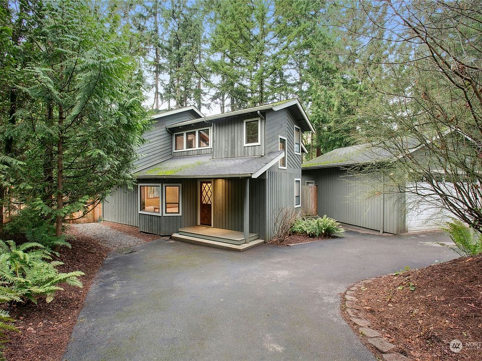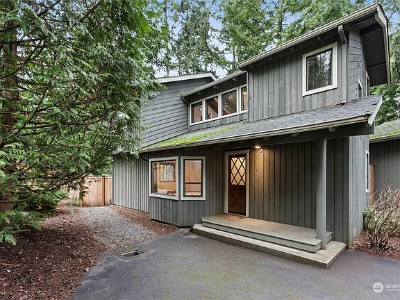 Nestled amidst lush, mature landscaping, this serene haven offers a perfect blend of privacy and convenience. On the main level, you'll find a well-appointed kitchen with a cozy eating nook, a warm living room, and a dining area that opens to the backyard deck. Upstairs, the home features two comfortable bedrooms and a full bath. Step out on the spacious deck in the backyard and immerse yourself in nature and the vibrant expanse of greenery - the perfect spot to relax or entertain. Just beyond the backyard, a creek weaves through, enhancing the sense of tranquility. Highly rated Lake Washington School District, easy access to Juanita Bay and St. Edward Park, where water activities and hiking trails await.