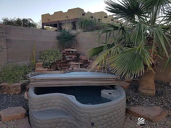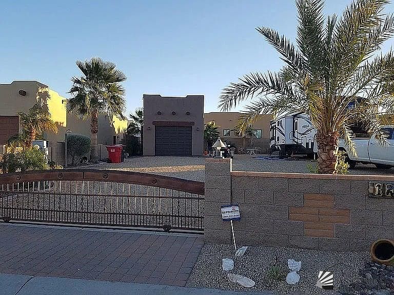 New Listing | $220,000 | El Rancho Encantado Subdivision 1 bedroom, 1 three-quarter bath casita featuring an attached 1-car garage, double sliding gates, and desert landscaping with irrigation. Outdoor amenities include a jetted tub beside a waterfall feature, covered cooking and serving area beneath a palm pergola patio, fire pit, and BBQ grill—all included with the sale.