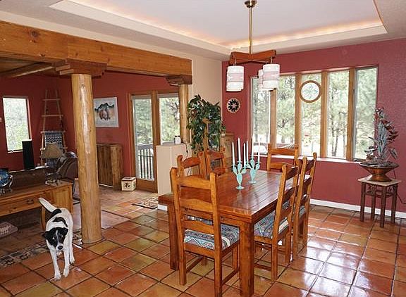 Designed by prominent local architect David Elfring. The main level is open, from the kitchen, through the dining room and into the great room, creating an bright, inviting space. There is a great deal of exposed wood on the main level (pillars, beams, vigas and latillas), adding warmth and helping to create a casual feel. There are several areas in the home with authentic hand-made Mexican Saltillo tile with wonderful variability in color, chips, and even a few dog foot prints! Doors and cabinetry on the main and the master suite level are solid pine, hand-made by Santa Fe Door Company in Albuquerque. Two of the doors on the main level have rare "saguaro cactus ribs". The sunken great room features a kiva-style gas fireplace, which creates a warm focal point when friends are over. The entertainment center is recessed and screened, so you can watch TV with the built-in surround sound when you want to. Kitchen has 5 burner gas cooktop and handy second prep sink.