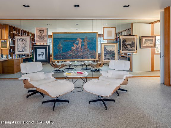 It's not often that one is offered the opportunity to own a piece of architectural history! Designed by the world-renowned architect Irving Tobacman, his signature style is evident throughout the home and provide an unparalleled living experience! Every room offers a hidden gem from the smoked glass panels that conceal exceptional storage, raw silk wall coverings, to the felt acoustic panels in the library, the sculptural the cool air returns, the attention to detail in the minuscule things are what make this home so unique. The heart of the home is the expansive great room featuring 10 foot ceilings that create a sense of grandeur & space. Built-in bar adds a touch of sophistication, perfect for entertaining guests. The gas fireplace provides a cozy ambiance, making this room ideal for both large gatherings & intimate evenings. One of the standout features of the home is its seamless transition from indoors to outdoors, enhancing the living space with the expansive patio & connecting you with the surrounding nature. The dining area, which comfortably seats 14, is perfect for hosting dinner parties. Custom kitchen is a chef's delight, designed with both functionality & style in mind. The curved edges of the ergonomically height designed island serves as a central focal point & practical workspace. Surrounded by 2 of almost everything..pantries, dishwashers, ovens & refrigerators, ensuring that everything you need is always within reach. Library offers oak paneled lined shelving, felt acoustic paneled walls & custom ceiling covering for a cozy space to retreat. The sound system for the house is controlled from the audio cabinet hidden behind panels in this room. The primary bedroom is a luxurious retreat, designed to offer comfort & privacy. Cozy fireplace adds warmth & charm, creating a relaxing atmosphere. Hidden storage, including luxurious luggage compartments, are behind the smoked glass mirrors provide a sleek & modern solution to keep your space clutter-free. Primary closet provides the possibility of a 2nd floor laundry for added convenience & the kind of storage most just dream of. Second & third bedrooms are furnished with custom-designed furniture by Tobacman himself, adding a unique & personal touch to each space. Lower level offers a versatile rec room/exercise room & full bath. This home is a true masterpiece in which every owner has truly appreciated as it reflects exceptional richness & makes it an extraordinary residence that stand out in every way! As Tobacman was once quoted as saying, "A white house looks good in every season."