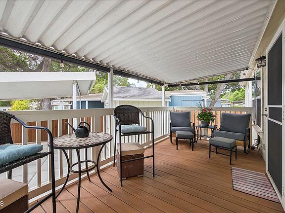 Gorgeous turn-key home located in the highly desirable Golden Oaks (55+) community. This lovely home features 2 bedrooms, 2 bathrooms plus an office/den, laundry room, vaulted ceilings, vinyl plank floors, central heat and air conditioning. The open concept floor plan has a great flow and offers an abundance of natural light. For those who enjoy cooking, you will love the spacious kitchen with a large center island, ample cabinet space, sleek counters and tile backsplash. Appointed with stainless steel appliances and a beautiful stainless steel apron front farm sink. There are single French doors with blinds between the glass in the living room, primary bedroom and guest room offer easy access to the great outdoors. The living room features a wood burning, flagstone fireplace perfect for cozying up next to while reading a book. When you enter the primary bedroom, it feels like you are stepping into your own private oasis with direct access to the deck, a customized closet with motion sensor lights for a more usable space and ceiling fan. The large attached bathroom has a contemporary walk in tile shower and nice vanity area. Two covered decks create a tranquil outdoor living space perfect for your morning coffee, afternoon nap or evening beverage. There is also the rare side by side carport which provides easy access to parking. The large Tuff Shed and a smaller shed out back are perfect for all of your storage needs. This is a beautiful park with majestic oak trees gracing its residence. The park amenities include a pool, clubhouse, dog park, community garden, RV parking and the Ojai Trolley stop is right out front. The low monthly space rent of $894.23 includes, trash, water and sewer. This home is stylish, tranquil and low maintenance making it the perfect place to enjoy retirement.