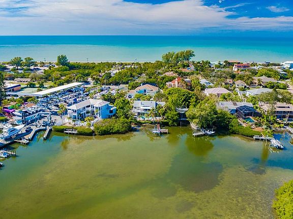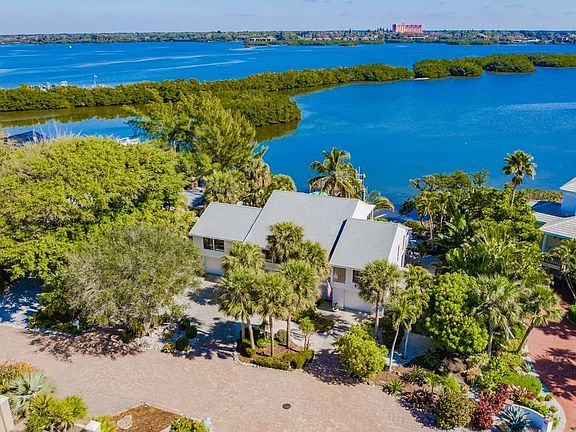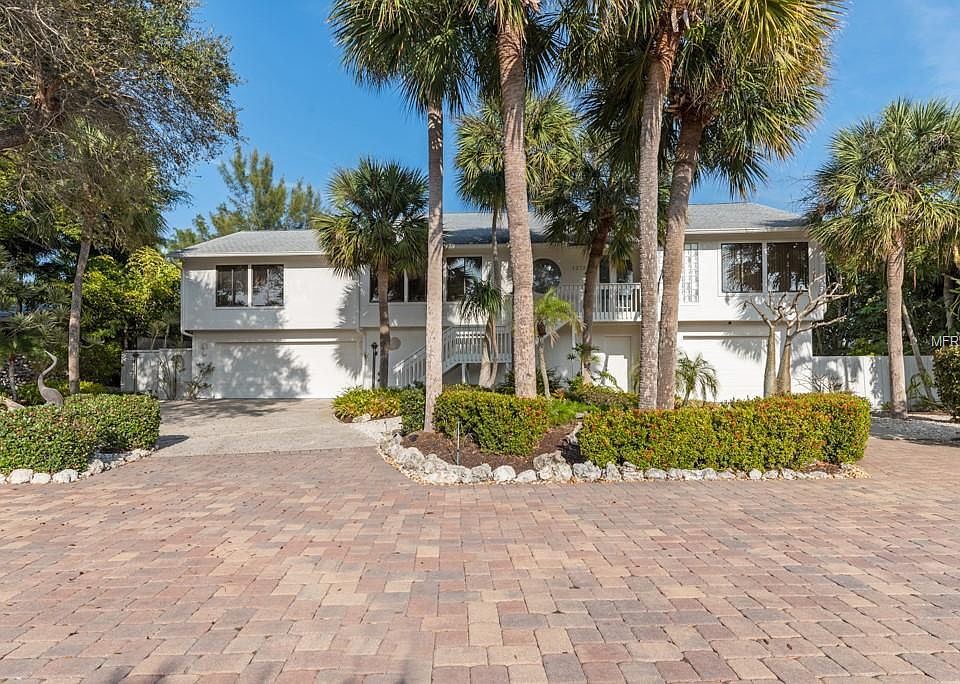 Boating and Beach! Stunning bay views, great boating water and deeded Gulf beach access come together to create this delightful island paradise. Idyllically located on the southern end of world-famous Siesta Key, on a private brick-paver road on a cul-de-sac, this bay front home captures the essence of island living. Tropical landscaping, attractive entry and expansive Bay view. The open living and dining room, with vaulted ceilings, round etched-glass dolphin window, celestial windows, fireplace, walls of mirrors, offer stunning views of the bay waters. The eat-in kitchen with breakfast area is perfectly positioned between multiple living spaces and covered lanai for seamless entertaining. The media room features its own built-in entertainment system. The master suite opens to a private deck and a master bath including two walk-in closets. The first level includes a bonus space with its own private entrance, one-car garage, full bath, sunroom, with access to the lanai and pool area. A boat dock with water and 30 amp electric circuits, a boat lift (13,000 lbs.), and twin floating "E-Z" jet docks. Salt-water pool, with lap-lane and spa, natural gas heated.This is the perfect home, located in a resort area. Close to a full service marine for all boats and yachts up to 69 feet, with travel lift, fuel, and ships store. Turtle Beach Park, boat ramps, restaurant, pub, and marina are all within this unique resort community. Free trolley to Siesta Key Beach, or to charming Siesta Village.
