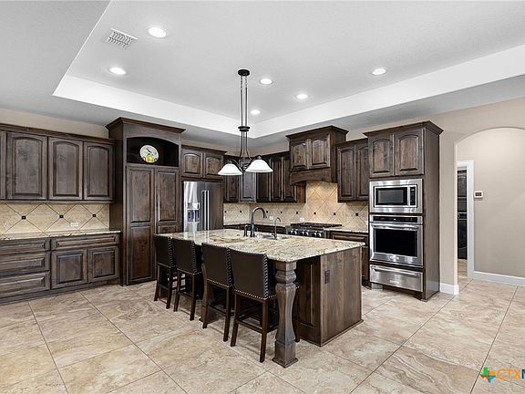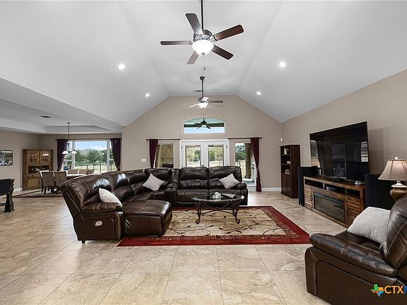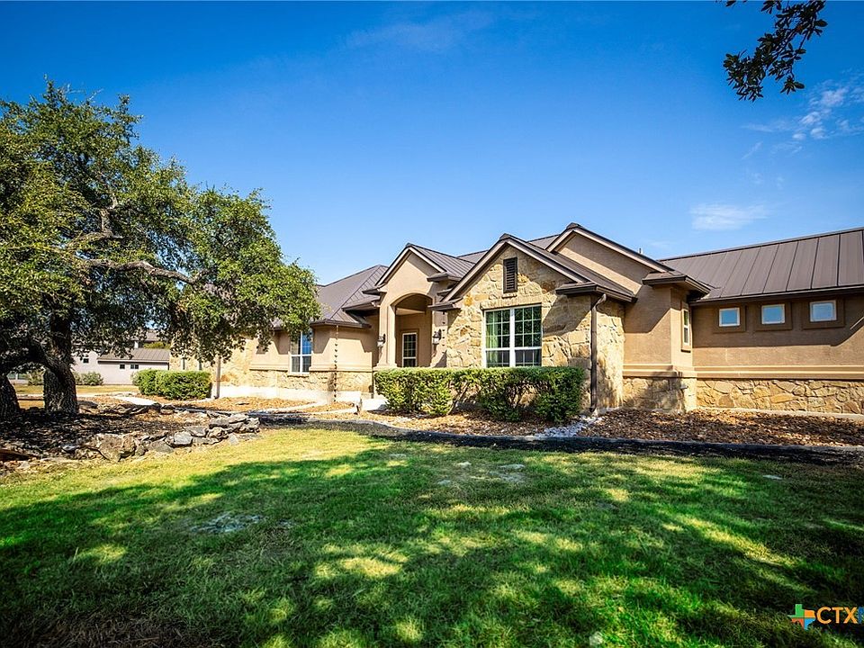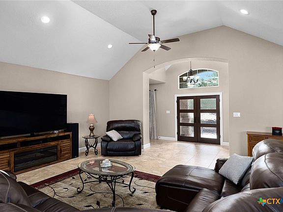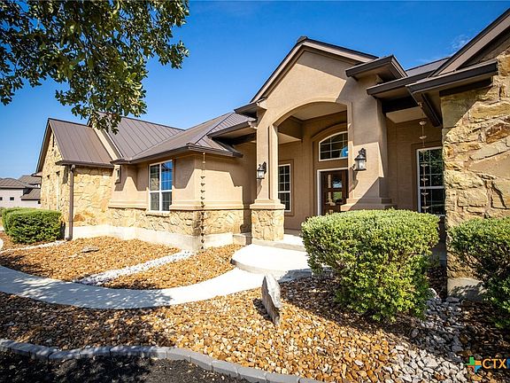 Hill Country elegance meets everyday comfort in this beautifully designed one-story home nestled on a level 1.27 acre lot with mature oak trees in the sought-after Vintage Oaks community. Boasting 3,190 sq. ft., this spacious 4-bedroom, 3-bathroom layout features soaring ceilings, an open-concept design, and an inviting living room with French doors. The gourmet kitchen is a chef’s dream with custom cabinetry, granite countertops, stainless steel appliances, a warming oven, and an oversized hidden butler’s pantry. The private primary suite offers a spa-like bath with a walk-in shower and garden tub. Enjoy the Texas lifestyle on the expansive covered patio complete with a gas/wood-burning fireplace—perfect for entertaining or quiet evenings under the stars. The oversized 3-car garage includes a utility sink for added convenience. Just a short stroll to the resort-style pool and amenities of Vintage Oaks—this is the home you’ve been waiting for.