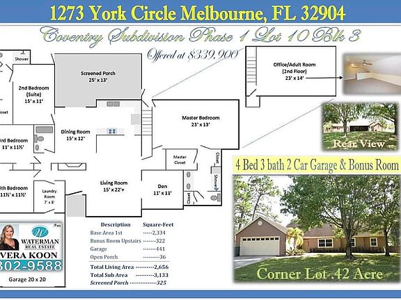 Vera Koon Team at Waterman Real Estate: Here is a wonderful opportunity to be the new owners of this spacious 4 bedroom 3 bath 2 car garage + Upstairs Bonus room with private access nestled on an oversized corner homesite (.42acre) in West Melbourne. This home features a large family room with vaulted ceiling, den area, Spacious Dining room with hardwood floors & fireplace that flows into the newer kitchen with great views to the peaceful backyard / porch area. Enjoy a large Owners Retreat withhardwood floors, (split bedroom design), large walk in closet, bathroom features dual sink vanity, oversized walk in tile shower too. Access the 2nd level BONUS room from owners retreat or rear exterior access. Bedroom 2 offers private bathroom & large walk in closet. Other: 25 x 13 screened porch, indoor laundry room & much more too tour!