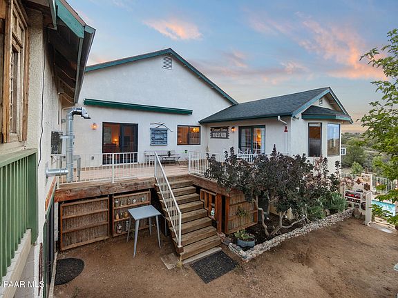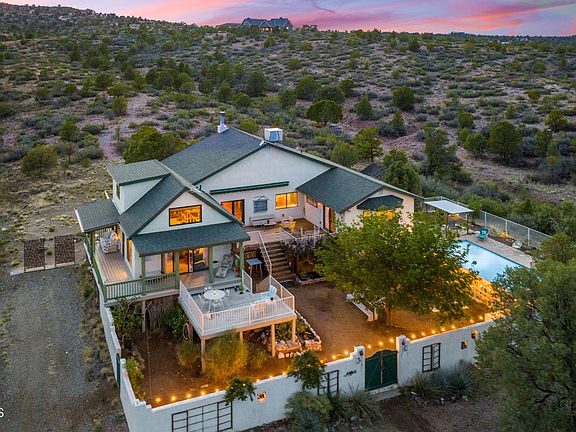 Price Reduced!Spectacular setting!This 2300 SF, 3 bedroom 3 bath Prescott home is located on 5 acres of rolling property. A private courtyard welcomes you with native plants, mosaic art wall and several patios to enjoy the views. Open living area with vaulted ceilings, built in bookcases & fireplace. Spacious cooks kitchen with local handcrafted wood shelves. Master bedroom with panoramic views, french doors to adjacent patio. There is a independent guest suite, overlooking the mountains & valley and operated as a successful super host Air BNB. Private in ground pool solar heated & rain harvested, outdoor shower with native gardens. Perfect horse set up-two horse stall/corral/hay shack & tack room., This setting offers incredible views, spectacular sunsets, wildlife and stargazing.