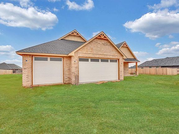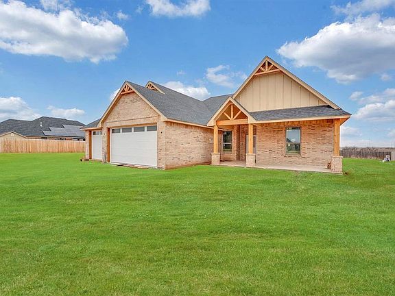 Absolutely beautiful quality new home. Large covered front porch. Wide front entry. Double entry closet. Huge open living area. Impressive brick fireplace with built in shelving on both sides. High ceilings, very open floor plan. Awesome kitchen island, breakfast bar, lots of beautiful custom cabinets & vent hood, built in wall oven, big walk in pantry. Utility room with sink. Built in bench & coat hanger & place to put shoes. Large secluded primary bedroom. Designer ceiling, luxury primary bath, deep whirlpool tub, separate tiled walk in shower, and double sinks. Huge walk in closet with built ins & drawers. 4th bedroom can be used as study, has a closet and barn door. Huge covered patio. Walls of windows for natural lights. Oversized 3 car garage. Call 580-248-8800 for private showings or text 580-581-7870 for more details.