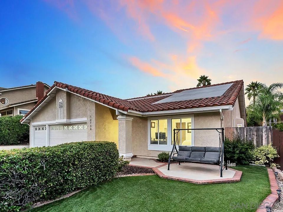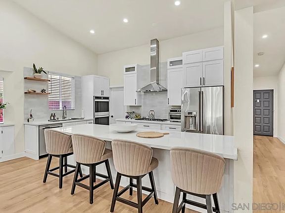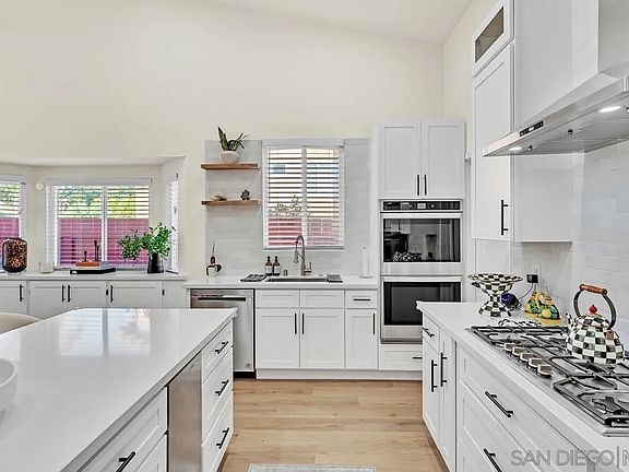 Discover the perfect blend of luxury and comfort in this rare 4-bedroom, 3-bathroom single-level home, nestled in the highly sought-after Rancho Arbolitos community of Poway. Every detail of this home has been meticulously renovated, showcasing an open floor plan that invites seamless living. Step into a modern dream kitchen adorned with quartz countertops, sleek shaker cabinets, stainless steel appliances, and a spacious walk-in pantry. Enjoy your morning coffee or evening wine at the stylish coffee + wine bar, complete with a built-in wine fridge. The luxurious flooring flows through the home, leading you to beautifully updated bathrooms, each designed with elegance and functionality in mind. With plenty of storage and LED recessed lighting throughout, every inch of this home is thoughtfully designed for convenience and style. The large open backyard is perfect for entertaining, featuring a built-in kitchen and seating area, ideal for hosting gatherings or enjoying serene outdoor moments. Located within walking distance to the Rancho Arbolitos Swim and Racquet Club and Silverset Park, this home is not just a residence, but a lifestyle. Energy efficiency is at the forefront with a new roof, owned 10kw solar system, and an energy-efficient central heat pump/AC system with a smart thermostat. Don’t miss this rare opportunity to own a beautifully renovated, single-level home in one of Poway’s most desirable neighborhoods. This is more than just a home—it's your sanctuary.