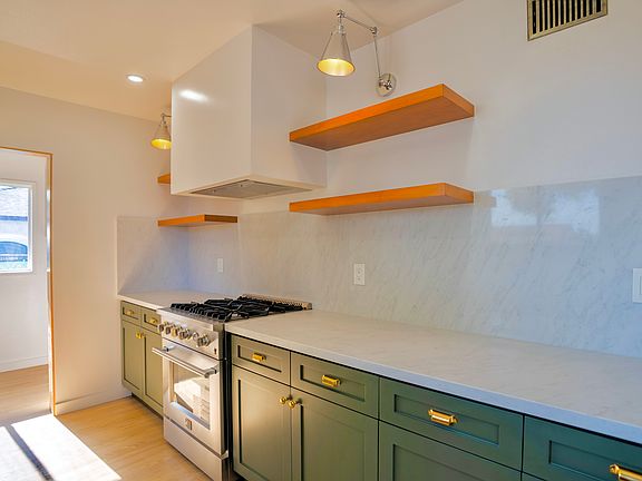 Inside, you'll find a bright and open floor plan with hardwood floors, recessed lighting, and oversized windows that fill the space with natural light. The living room flows into a functional dining area and a stylish kitchen with ample counter space, modern appliances, open shelving, and gold-accented finishes.