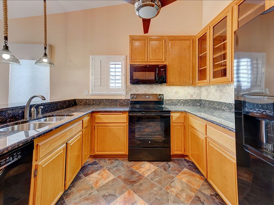 -Well-appointed kitchen with granite countertops, all black appliances as refrigerator, microwave, range and dishwasher, wood cabinets and a breakfast bar.