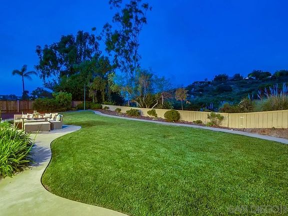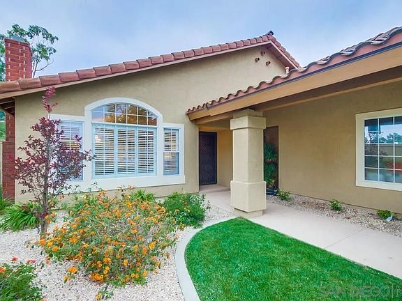 This inviting single-story floor plan in Poway's desirable Rancho Arbolitos neighborhood occupies a prime inner position on a peaceful cul-de-sac. But it's really all about the view. The stunning backyard provides a panoramic vista of "green-belt" open space stretching to the mountains beyond, with virtually unlimited possibilities for playtime, entertaining or just relaxing in your favorite chair. Inside, soaring vaulted ceilings enhance the feeling of spaciousness and light. The kitchen and breakfast nook feature abundant storage, as do floor-to-ceiling cabinets in the family room. Upgraded flooring includes newer, neutral carpeting and Italian porcelain tile in the entryway, kitchen, bathrooms and laundry room. Custom plantation shutters in the living room and dining room complement custom faux wood blinds throughout the house. Upgraded fixtures in the dining room, kitchen/nook, and entryway feature all-LED lighting. In addition to its impressive ceiling height, the oversized primary bedroom offers a walk-out sliding door to its own patio and an ensuite bathroom with walk-in closet. Each of the three spacious secondary bedrooms features large windows and substantial closet space. All has been lovingly cared for by its original owners for 36 years. Situated on a .47-acre lot, the newly landscaped lawn boasts upgraded sprinkler and drip systems, front and back. The recently painted exterior includes an all-new front walkway bordered by an attractive planting area. Three-car garage includes a workbench area, recently upgraded water heater and water-softening system.