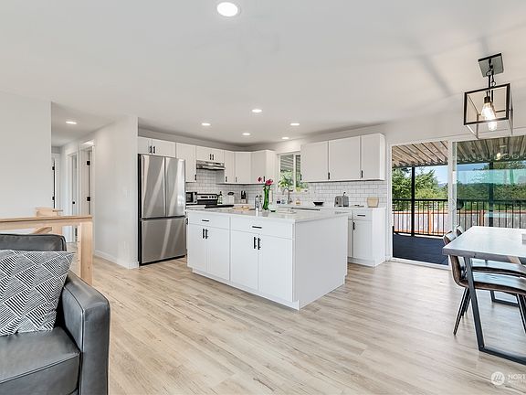Beautifully updated home on private 9+ acres in Tumwater School District! With modern & fresh updates, this classic split entry design has so much to offer. Upstairs, you'll enjoy a gorgeous gourmet kitchen complete with stainless steel appliances, quartz counters and high quality cabinetry, three generous bedrooms and a stunning bathroom complete with gorgeous shower tile surround. Lower floor offers a second living room with cozy wood burning fireplace, and a den, perfect as office space, guest room, or second primary bedroom. Newer LVP flooring throughout, shiplap fireplaces, wood wrapped windows. Large covered deck with newly fenced in yard & beautiful territorial views!! You will enjoy the rural living, yet quick and easy access to I-5