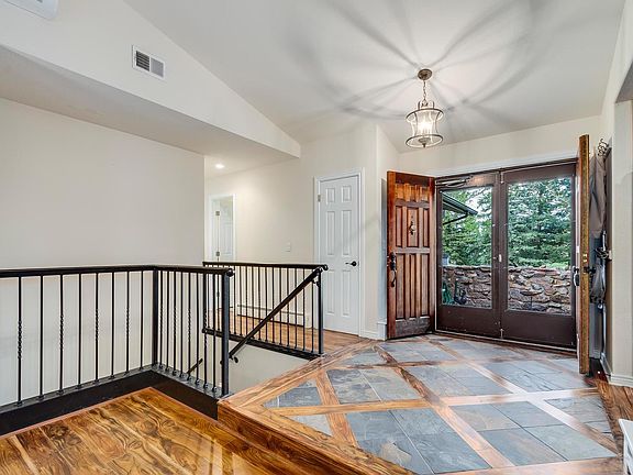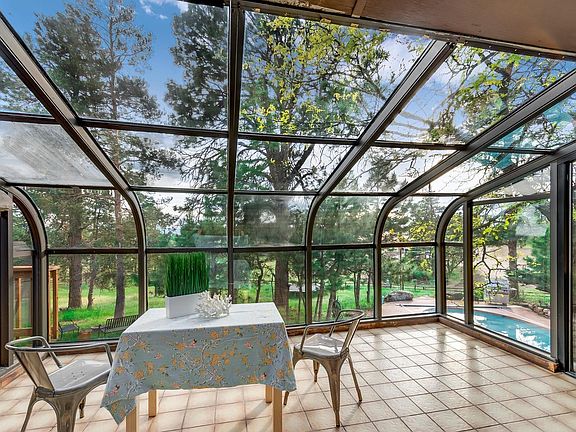 Located in Parker Colorado, this Ponderosa Hills walkout ranch on 2.86 acres of pine trees with an expansive corridor of mountain views. The home has been modernized over the years with new cherry kitchen cabinets, slab granite tops, acacia wood floor, coved ceilings, appliances, five piece master bath with marble tile and granite tops, aspen paneling, metal rails, newer carpet, roof, boiler, a/c, and septic system. The kitchen features are very functional with a butler counter space to serve from the adjacent dining room. The main floor master suite with attached bath and spacious walk-in closet simply beams with natural light. Also on this level are two bedrooms, a full bath and a large study with fireplace. Stroll out of the walkout to take a lap in the heated pool or meander down to the three-stall barn to visit your barnyard pets! The Ponderosa Hills community is a popular setting and this property is sure to satisfy.