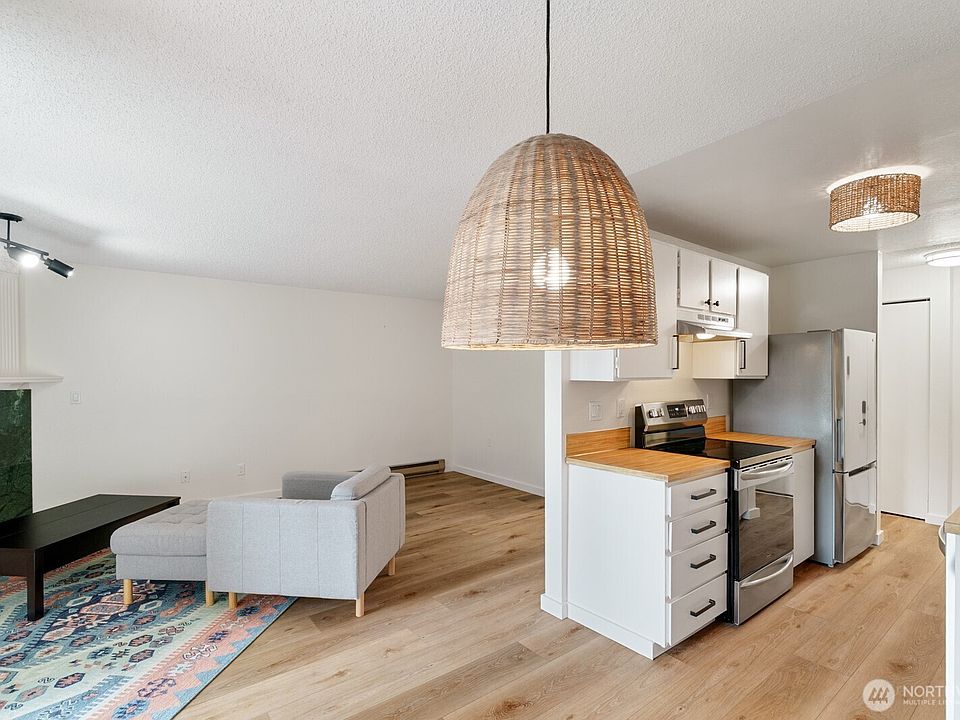 Beautifully remodeled condo in Kirkland’s desirable Woodside Terrace community! This spacious 681 sq ft unit features luxury vinyl plank flooring throughout, fresh interior paint, updated light fixtures, and brand-new kitchen appliances (refrigerator, range, and dishwasher). The open living area includes a classic marble fireplace and flows to a private covered balcony—great for morning coffee or evening sunsets. The bathroom offers a sleek white marble vanity. Bonus features include exterior storage, assigned parking right in front, and access to a community pool. Prime location just 1 mile to The Village at Totem Lake with dining, shopping, and a cinema. Easy access to I-405 and Eastside tech hubs. No rental cap—excellent for investors!