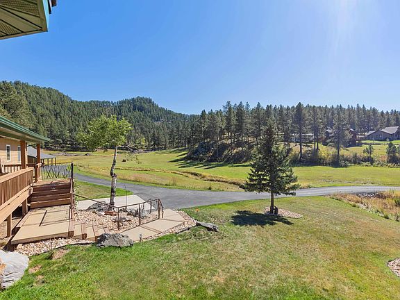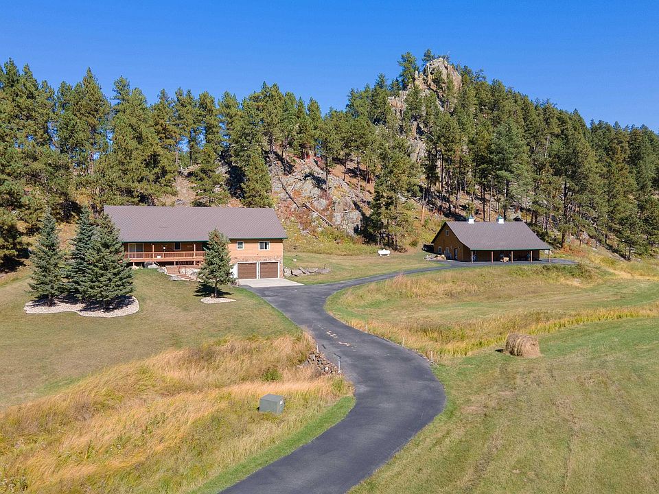 A one-of-a-kind retreat nestled in the heart of the Black Hills, offering two thoughtfully designed homes on a spacious lot plus an additional parcel, totaling 10.77 acres of natural beauty. This exceptional property is graced by Palmer Creek winding through a lush meadow, creating a serene & private setting where you’ll enjoy abundant wildlife & peaceful views. Ideally situated, you’ll find yourself just 20 minutes from Rapid City & only 6 minutes from Hill City, w/ convenient access to Sheridan Lake & the highway. The main home invites you in, featuring two generous bedrooms & two full bathrooms on the main floor. The open living, dining, & kitchen area is a true showpiece, boasting custom hickory cabinets, stunning Quartzite countertops, top-of-the-line JennAir gas cooktop, vent & indoor grill, elegant tile flooring, & a large, inviting fireplace. Step out the living room to a generous paved concrete patio that looks up to the majestic rocks jutting out of the earth. The Primary Bedroom is a great place to cuddle up & enjoy the beautiful private views or snuggle up to the fireplace ambers. W/ a his & hers walk-in closet, there will be no fighting for closest space. The second bedroom is across the hall w/ an attached bathroom accessible to guests. A main floor laundry/office adds everyday convenience, while a handy dumb-waiter streamlines daily living. Downstairs, an oversized two-car garage, a versatile workshop, & unfinished space present exciting opportunities for expansion or hobbies. Step outside & take in majestic vistas from multiple outdoor living spaces, or wonder down to Palmer Creek for moments of quiet reflection. A fully remodeled second home offers flexible living options, featuring three bedrooms, a beautifully appointed custom kitchen, a modern walk-in shower, & a spacious bonus room ideal for family gatherings or a home office. This guest house is perfect for extended family, visitors, or as an income opportunity. A paved driveway too!!!